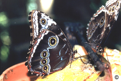 "Blue Morphos Feeding On Mango Fruit"